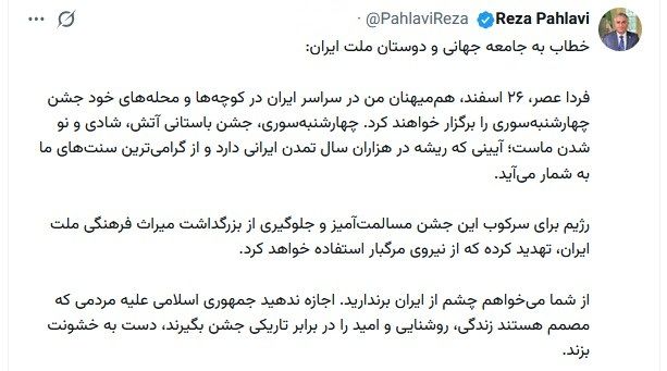 شاهزاده رضا پهلوی در پیامی با اشاره به اینکه ایرانیان فردا در سراسر ایران جشن چهارشنبهسوری را برگزار خواهند کرد، نوشت: «رژیم برای سرکوب این جشن مسالمتآمیز و جلوگیری از بزرگداشت میراث فرهنگی ملت ایران، تهدید کرده که از نیروی مرگبار استفاده خواهد کرد.»او خطاب به جامعه جهانی و دوستان ملت ایران، ادامه داد: «از شما میخواهم چشم از ایران برندارید. اجازه ندهید جمهوری اسلامی علیه مردمی که مصمم هستند زندگی، روشنایی و امید را در برابر تاریکی جشن بگیرند، دست به خشونت بزند.»