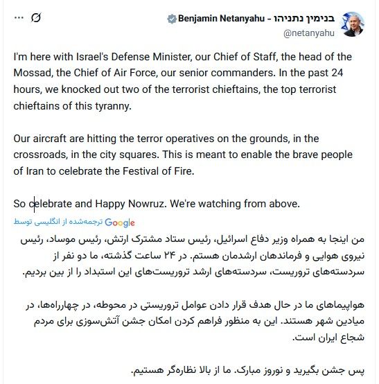 آقای نتانیاهو گفت: «هواپیماهای ما در حال هدف قرار دادن نیروهای تروریستی در میادین، چهارراهها و خیابانهای شهر هستند. این اقدام با هدف فراهم کردن زمینهای برای مردم شجاع ایران است تا «جشن آتش» (چهارشنبه سوری) را برگزار کنند.»