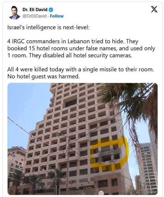 بر اساس ادعایی که در شبکه اجتماعی ایکس توسط الی دیوید منتشر شده، چهار فرمانده سپاه پاسداران که در لبنان حضور داشتند برای مخفی ماندن ۱۵ اتاق در یک هتل را با نامهای جعلی رزرو کرده بودند، اما تنها از یک اتاق استفاده میکردند و حتی دوربینهای امنیتی هتل را نیز از کار انداخته بودند.به گفته او، با وجود این اقدامات، محل دقیق حضور آنها شناسایی شد و یک موشک هدایتشده تنها همان اتاق را هدف قرار داد. در تصویری که همراه این ادعا منتشر شده، بخشی از یک هتل دیده میشود که به طور موضعی تخریب شده، در حالی که سایر قسمتهای ساختمان سالم به نظر میرسد.