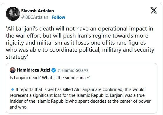 سیاوش اردلان، خبرنگار بیبیسی، در واکنش به خبر کشته شدن علی لاریجانی، توییتی از حمیدرضا عزیزی* را بازنشر کرد که در آن آمده بود:«مرگ علی لاریجانی تأثیر عملیاتی مستقیمی بر روند جنگ نخواهد داشت، اما با حذف یکی از معدود چهرههایی که توان هماهنگسازی میان راهبردهای سیاسی، نظامی و امنیتی را داشت، احتمالاً جمهوری اسلامی را به سمت سختگیری بیشتر و رویکردی نظامیتر سوق خواهد داد.»