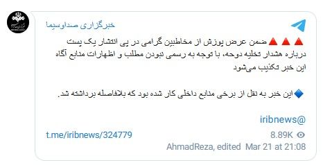 پیش از این پیام، خبری مبنی بر چنین «هشداری» در خبرگزاری صدا و سیما و دیگر رسانههای داخلی منتشر شده بود با این عنوان که «ایران برای تخلیه شهر دوحه قطر هشدار تخلیه صادر کرد.»