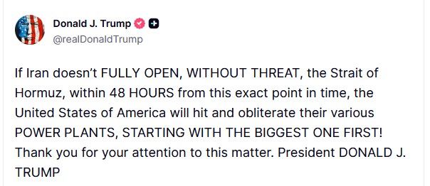 «اگر ایران ظرف ۴۸ ساعت از همین لحظه، تنگه هرمز را بدون هیچگونه تهدیدی بهطور کامل باز نکند، ایالات متحده آمریکا نیروگاههای مختلف آنها را هدف قرار داده و با خاک یکسان خواهد کرد؛ و این کار را از بزرگترین نیروگاه آغاز میکند!