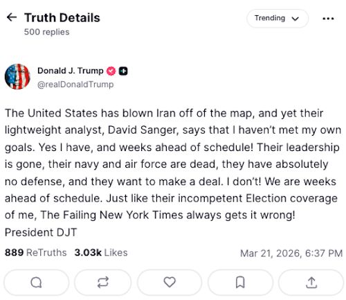 دونالد ترامپ، رئیسجمهوری آمریکا روز شنبه در واکنش به مقالهای در روزنامه نیویورکتایمز به قلم دیوید سنگر، مبنی بر عدم دستیابی او به اهدافش در جنگ با ایران، در شبکه اجتماعی «تروتسوشال» نوشت: «ایالات متحده ایران را از روی نقشه محو کرده است و با این حال دیوید سنگر، تحلیلگر سطحی آنها میگوید من به اهداف خود نرسیدم. بله رسیدم، آن هم هفتهها جلوتر از برنامه. رهبریشان از بین رفته، نیروی دریایی و هواییشان نابود شده و هیچگونه دفاعی ندارند.»