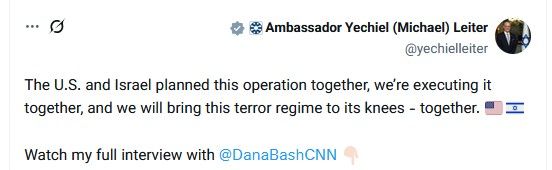 The U.S. and Israel planned this operation together, we’re executing it together, and we will bring this terror regime to its knees - together. 🇺🇸🇮🇱