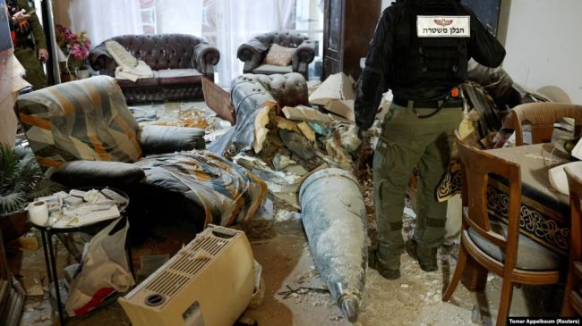 بخشی از یک موشک ایرانی داخل یک اتاق نشیمن در شهر رخووت، اسرائیل، ۲۹ اسفندرادیو فردا: فرنوش رام ( اسرائیل)