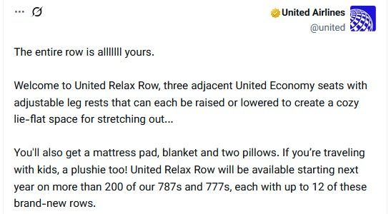Welcome to United Relax Row, three adjacent United Economy seats with adjustable leg rests that can each be raised or lowered to create a cozy lie-flat space for stretching out...