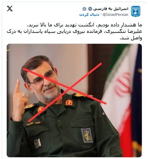صفحه رسمی وزارت خارجه اسرائیل در شبکه ایکس، با انتشار عکسی از علیرضا تنگسیری، کشته شدن او را تایید کرد.