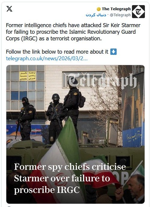 رؤسای پیشین نهادهای اطلاعاتی بریتانیا در مقالهای که برای روزنامه تلگراف نوشتند، از کییر استارمر، نخست وزیر بریتانیا بهدلیل خودداری از قرار دادن نام سپاه پاسداران انقلاب اسلامی در فهرست سازمانهای تروریستی انتقاد کردهاند.
