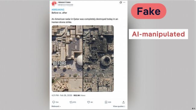 اسکرینشات از پستی در شبکه اجتماعی ایکس که ظاهراً "قبل و بعد" از تخریب یک رادار آمریکایی در قطر بر اثر حمله پهپادی جمهوری اسلامی را نشان میدهداین تصاویر البته اساسا مربوط به قطر نیستند. این محل، در واقع یک پایگاه دریایی ایالات متحده آمریکا در منامه، در کشور بحرین است.تصویر "قبل" دقیقاً با یک تصویر واقعی از Google Earth که در تاریخ ۱۰ فوریه ۲۰۲۵ ثبت شده، مطابقت دارد بهطوری که حتی موقعیت خودروها نیز کاملاً یکسان است.