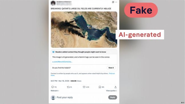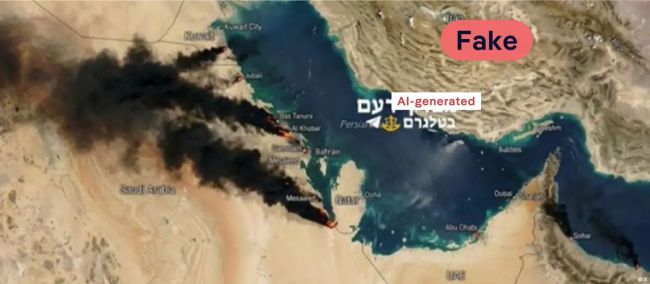 یک کاربر در شبکه اجتماعی ایکس (توییتر سابق) تصویری منتشر کرده که بهنظر میرسد تصویر ماهوارهای از خلیج فارس است و ادعا میکند میادین نفتی قطر در حال سوختن هستند. اگرچه تأسیسات گاز مایع قطر واقعاً مورد هدف قرار گرفته بودند، اما این تصویر جعلی است. وجود واترمارک جمینی (Gemini) در گوشه تصویر نشان میدهد که با هوش مصنوعی ساخته شده است.