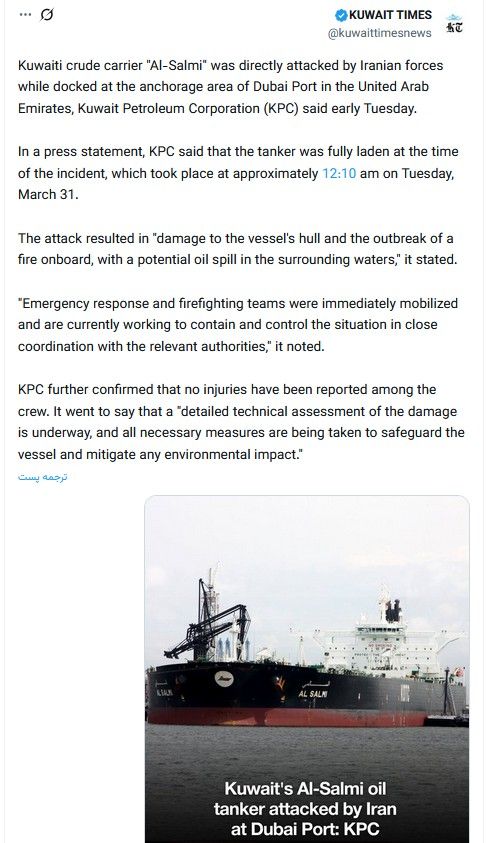 آرشیوصدای آمریکا: شرکت نفت کویت میگوید یک نفتکش عظیم کویتی در حالی که در بندر دبی در امارات متحده عربی حضور داشت، هدف «حمله مستقیم و شرورانه» جمهوری اسلامی ایران قرار گرفت.خبرگزاری دولتی کویت با انتشار این مطلب گزارش داد که در زمان حمله، نفتکش کاملاً بارگیری شده بود و این حمله باعث خسارت مادی به بدنه کشتی و آتشسوزی در عرشه شد.
