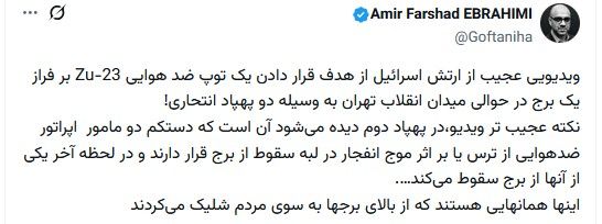 امیرفرشاد ابراهیمی در شبکه اکس نوشتویدیویی عجیب از ارتش اسرائیل از هدف قرار دادن یک توپ ضد هوایی Zu-23 بر فراز یک برج در حوالی میدان انقلاب تهران به وسیله دو پهپاد انتحاری!