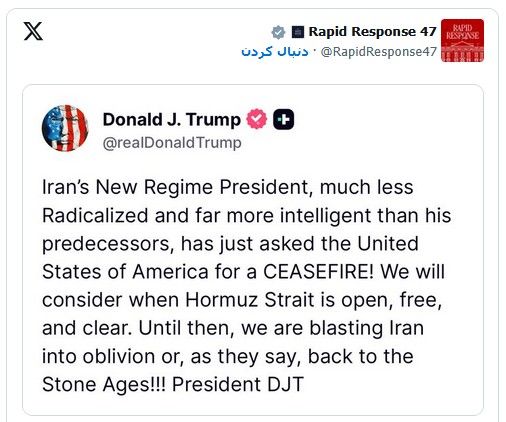 او نوشت: «رئیسجمهور رژیم جدید ایران، که بسیار کمتر تندرو و بهمراتب باهوشتر از پیشینیان خود است، بهتازگی از ایالات متحده آمریکا درخواست آتشبس کرده است! ما زمانی این موضوع را بررسی خواهیم کرد که تنگه هرمز باز، آزاد و امن باشد. تا آن زمان، ما ایران را کاملاً درهم میکوبیم یا بهاصطلاح آنها، به عصر حجر بازمیگردانیم!!!»