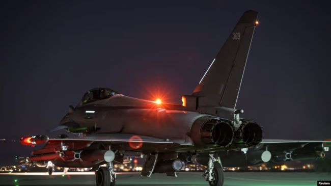 یک فروند جنگنده تایفون بریتانیا (آرشیو)صدای آمریکا: ارتش بریتانیا میگوید چندین پهپاد جمهوری اسلامی را در منقطهای پرخطر سرنگون کرده است.وزارت دفاع بریتانیا روز چهارشنبه ۱۲ فروردین با انتشار بیانیهای اعلام کرد که توپچیهای هنگ نیروی هوایی سلطنتی این کشور، مستقر در منطقهای با سطح تهدید بالا، طی شب گذشته بیش از ۱۰ پهپاد جمهوری اسلامی را سرنگون کردهاند.