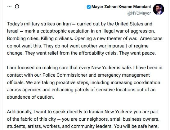 آقای ممدانی در آغاز جنگ ایران، حملات آمریکا و اسرائیل را «بالا گرفتن فاجعهبار جنگی غیرقانونی تجاوزکارانه» توصیف کرده بود.