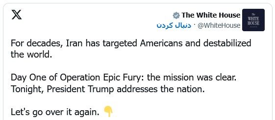 حساب کاربری کاخ سفید ساعاتی پیش از سخنرانی دونالد ترامپ، رئیسجمهور آمریکا، در چهارشنبهشب به وقت واشنگتن، با انتشار پستی در شبکه اجتماعی ایکس و ویدیویی از مارکو روبیو، وزیر امور خارجه آمریکا، نوشت: جمهوری اسلامی «ایران دههها است که آمریکاییها را هدف قرار داده و جهان را بیثبات کرده است. روز نخست عملیات خشم حماسی: مأموریت مشخص بود. امشب، رئیسجمهوری، ترامپ خطاب به ملت سخنرانی خواهد کرد.»