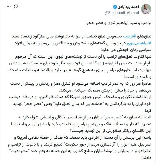 احمد زیدآبادی: "<عصر ج.ا> هزاران بار از نقطهنظر بیاخلاقی و انسانستیزی برای من ارجحیت دارد، به عصر قاتلان سرکردگان حکومت ضدبشری اسلامی که ترامپ و نتانیاهو خود را مظهر آن میدانند"😖