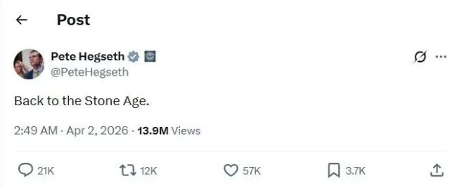 پیت هگست، وزیر دفاع آمریکا هم بلافاصله در شبکه ایکس عبارت «بازگردان به عصر حجر» را تکرار کرد