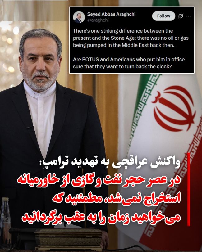 عراقچی در شبکه اجتماعی ایکس نوشت: «یک تفاوت فاحش میان عصر حاضر و عصر حجر وجود دارد: در آن زمان هیچ نفت و گازی در خاورمیانه پمپاژ نمیشد. آیا رئیسجمهور ایالات متحده و آمریکاییهایی که او را به قدرت رساندند، مطمئن هستند که میخواهند عقربههای ساعت را به عقب بازگردانند؟»