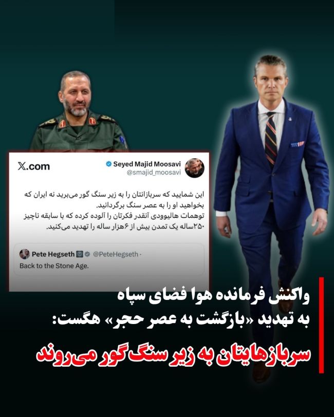 حساب کاربری مجید موسوی، فرمانده هوا فضای سپاه پاسداران روز پنجشنبه ۱۳ فروردین در واکنش به پیام پیت هگست، وزیر جنگ ایالات متحده در اکس که همزمان با دونالد ترامپ، ایران را به بازگشت به «عصر حجر» تهدید کرده بود، نوشت: «این شمایید که سربازانتان را به زیر سنگ گور میبرید نه ایران که بخواهید او را به عصر سنگ برگردانید. توهمات هالیوودی آنقدر فکرتان را آلوده کرده که با سابقه ناچیز ۲۵۰ساله یک تمدن بیش از ۶هزار ساله را تهدید میکنید.»