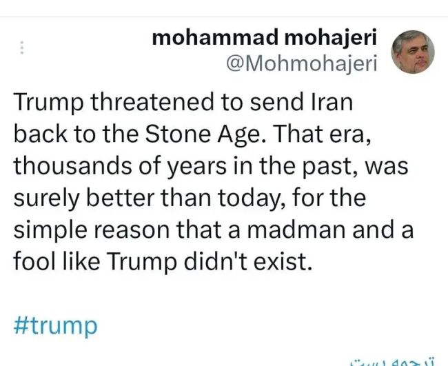 ترامپ گفته میخواهد ایران را به عصر حجر برگرداند. عصر حجر که به هزاران سال پیش برمی گردد حتما بهتر از امروز بوده، چون دیوانه و احمقی مثل ترامپ، وجود نداشته است.