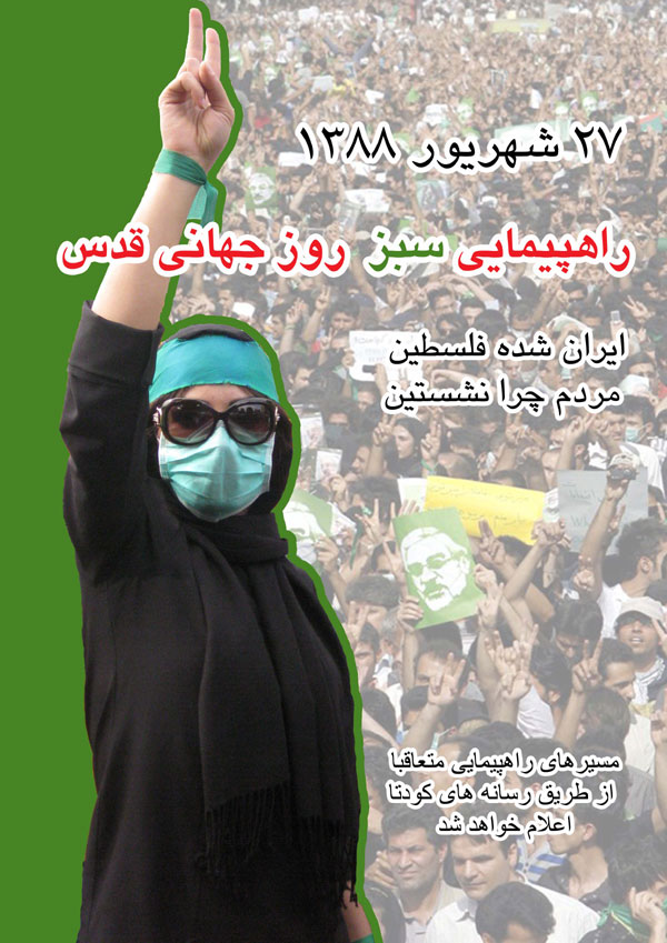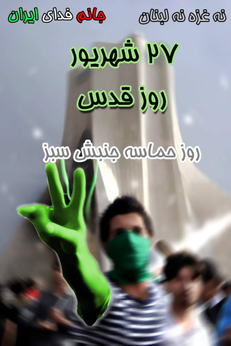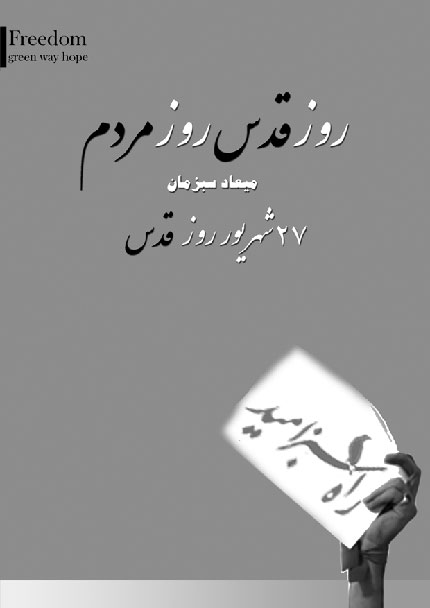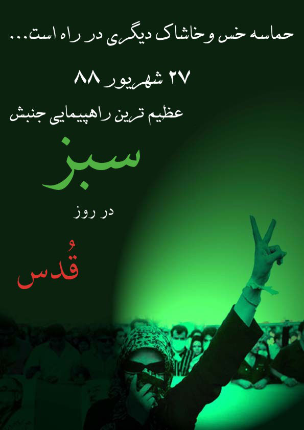 | گروهبان قندلی - ایران - تهران | پوسترهای فراخوان راهپیمایی سبز روز قدس در حمایت از رژیم اخوندی و کسب اعتبار در جهان . همه سرکاریم . | پنجشنبه 26 شهریور 1388 |