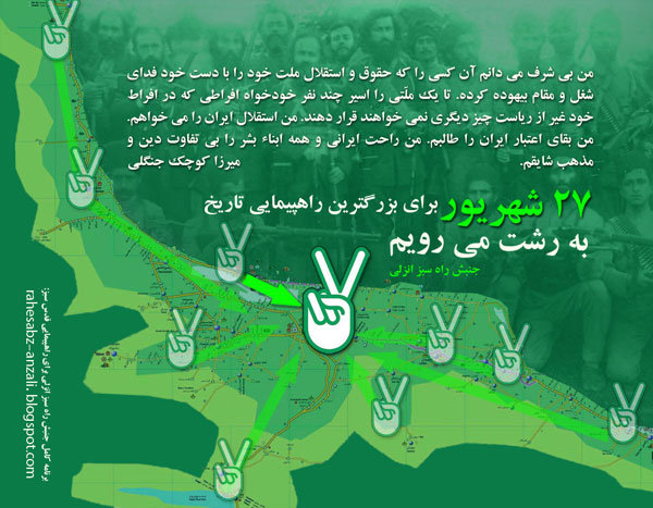 از اینکه عکس کسروی و مصدق و میرزا کوچک جنگلی و دلیر تبریز(ستارخان) را پهلوی هم گذاشتند خیلی خوشم اومد.شاد باد روح بزرگمردان ایران زمین.مرگ بر خامنه ای و رژیم ولایت وقیح.پیش به سوی دموکراسی و آزادی ایران. |