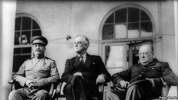 از راست: وینستون چرچیل، نخست وزیر بریتانیا، فرانکلین روزولت، رییس جمهور آمریکا و ژوزف استالین، رهبر اتحاد جماهیر شوروی