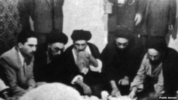آیتالله کاشانی بر سر سفره در میان هوادارانش، آیتالله خمینی نفر اول از سمت راست